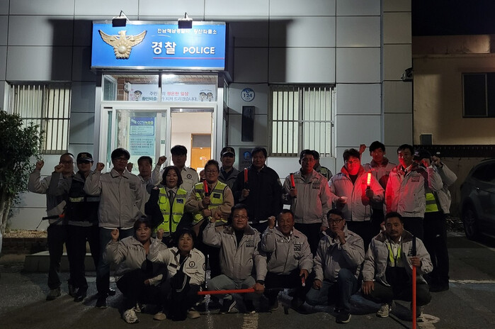 | ▲ 해남경찰서 황산파출소, 지난 2일 황산면자율방범대와 5일시장, 외국인 노동자 숙소 밀집지역 등 취약지 합동 순찰활동에 앞서 기념촬영 / 해남경찰서 제공 |