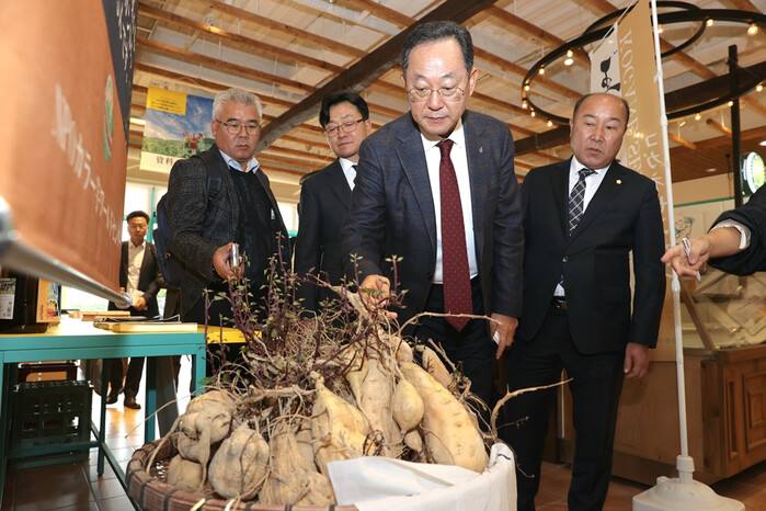 | ▲ 명현관 해남군수가 21일 일본 가고시마 NPO고구마월드센터를 방문해 일본산 고구마 품종을 살펴보고 있다. / 해남군 제공 |