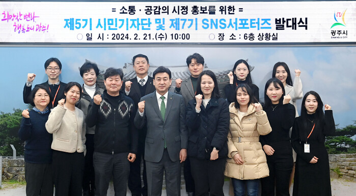 경기 광주시가 21일 시민과의 소통 강화를 위해 ‘7기 SNS 서포터즈 및 5기 시민기자단 발대식’을 개최했다. 시청 중회의실에서 열린 발대식에는 방세환 시장과 SNS 서포터즈, 시민기자단 등 관계자 20여명이 참석했으며 위촉장 수여를 축하했다. 사진은 방 시장(앞줄 왼쪽 네 번째) 및 관계자들이 기념촬영을 하고 있는 모습. (사진=광주시청 제공)