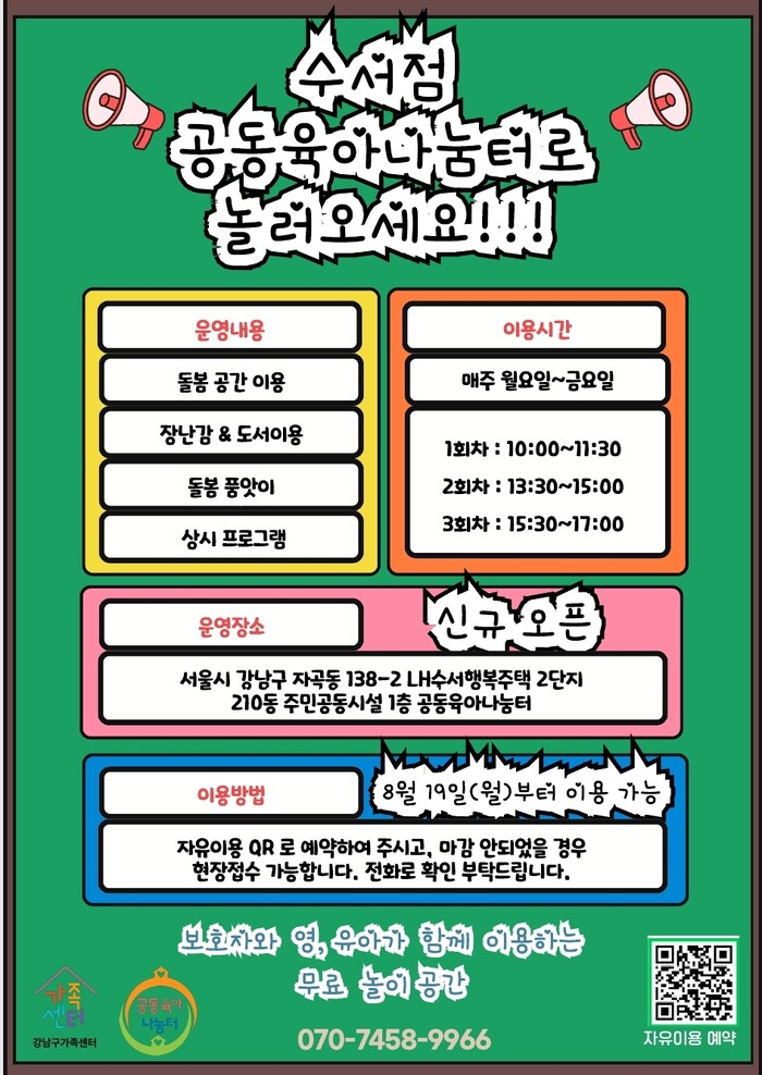 강남구가족센터 홈페이지 및 QR코드를 통해 사전 예약하고, 마감이 안 됐을 경우 현장 접수가 가능하다. 이용과 관련한 자세한 내용은 공동육아나눔터로 전화 문의하면 된다.