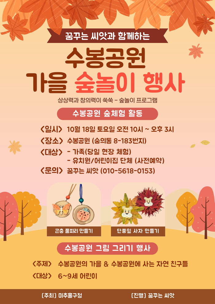 [인천=문찬식 기자] 인천 미추홀구(구청장 이영훈)는 오는 18일 수봉공원(숭의동 8-183)에서 가을의 정취를 만끽할 수 있는 ‘가을 숲 놀이 행사’를 개최한다.
