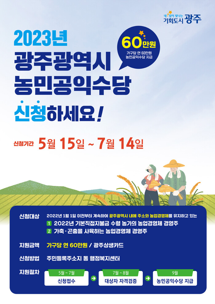 광주시는 지난 5월 15일부터 ‘광주 농민공익수당’ 신청을 받고 있으며 오는 14일 접수 마감한다. 아직 신청하지 않은 농업경영체 경영주는 14일까지 주소지 행정복지센터를 방문해 지급신청서 등을 제출하면 된다.