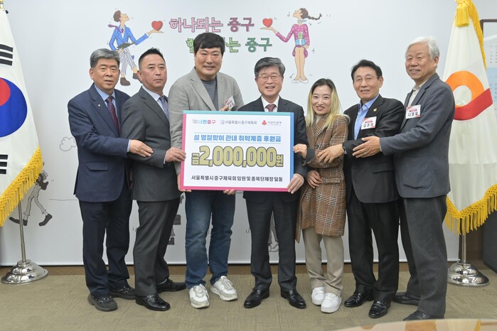 서울 중구가 최근 서울시중구체육회로부터 지역내 취약계층을 위한 후원금 200만원을 기탁받았다. 사진은 기탁식에서 김길성 구청장(가운데)과 관계자들이 기념촬영을 하고 있는 모습. (사진=중구청 제공)