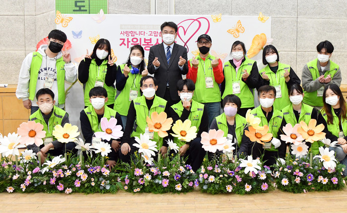 오승록 서울 노원구청장은 최근 ‘2022 자원봉사자 축제 한마당’에 참석했다. 이날 행사에는 자원봉사자 300여명이 참석했다. 사진은 오승록 구청장(둘째 줄 가운데)이 표창장 수여자들과 기념촬영을 하고 있는 모습. (사진제공=노원구청)