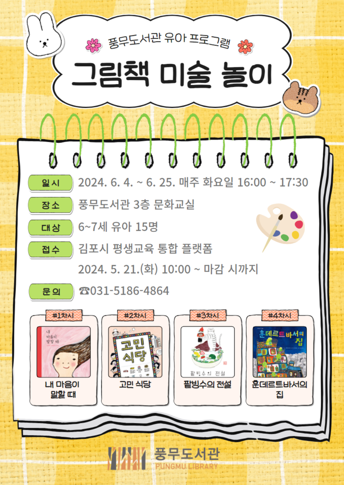 [김포=문찬식 기자] 경기 김포시 풍무도서관이 유아 프로그램 ‘그림책 미술 놀이’를 오는 6월4일부터 25일까지 매주 화요일 오후 4시에 풍무도서관 문화교실에서 운영한다고 밝혔다.