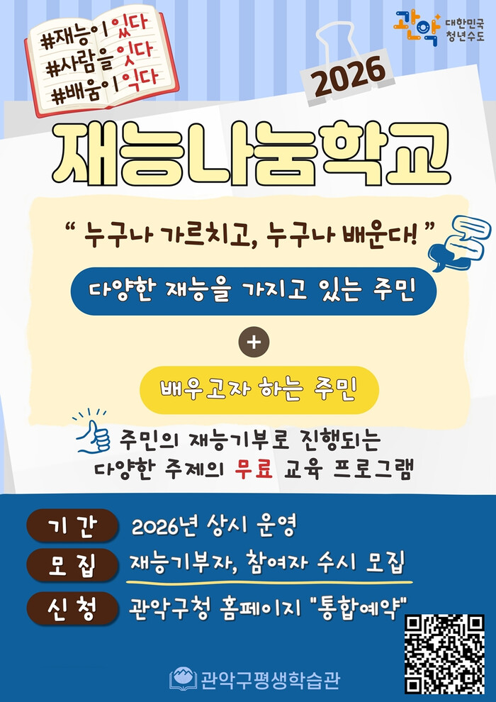 [시민일보 = 문민호 기자] 서울 관악구(구청장 박준희)가 이웃과 재능을 나누며 지역사회의 소통을 이끄는 ‘재능나눔학교’를 상시 운영한다고 3일 밝혔다.