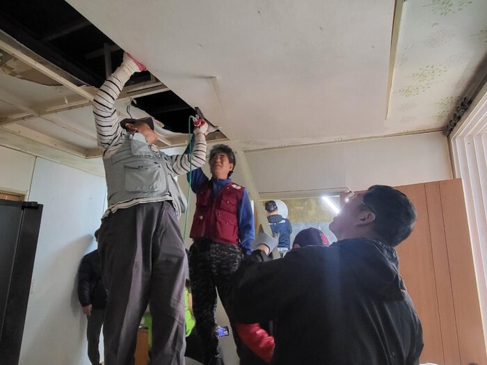 사단법인 구리시자원봉사센터는 최근 경기 구리시 아차산로의 한 가정에서 ‘2024 경기 사랑 愛 집 고치기’ 활동을 전개해 노후된 도배 장판 및 누수로 인해 처진 천장을 보수했다. 사진은 이날 봉사자들이 천장을 보수하고 있는 모습. (사진=구리시청 제공)