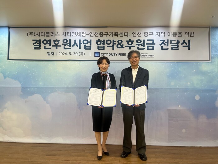 [인천=문찬식 기자] 인천중구가족센터와 (주)시티플러스 시티면세점은 최근 ‘지역 아동 1:1 결연 후원을 위한 업무협약 및 후원금 전달식’을 개최했다.