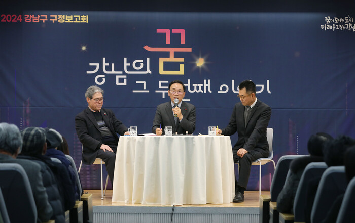 서울 강남구가 22일 청담평생학습관에서 압구정·청담동 주민들을 대상으로 제3차 구정 보고회를 개최했다. 사진은 구민 질문에 답변하고 있는 조성명 구청장(가운데)의 모습. (사진= 강남구청 제공)