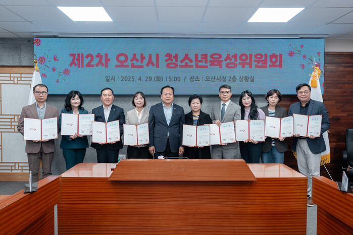 경기 오산시가 최근 시청 상황실에서 청소년육성위원회 위촉식 및 정기회의를 개최했다. 사진은 이권재 시장(왼쪽 다섯 번째)이 신규 위원들과 기념 촬영을 하는 모습. (사진=오산시청 제공)