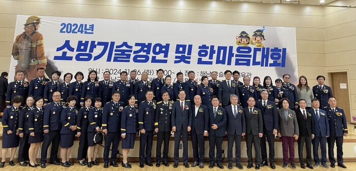 | ▲ 해남소방서, 의용소방대 연합회 주관 지난 26일 해남군 우슬동백 체육관에서 “2024년 의용소방대 기술경연 및 한마음 대회” 개최 기념촬영 / 해남소방서 제공 |