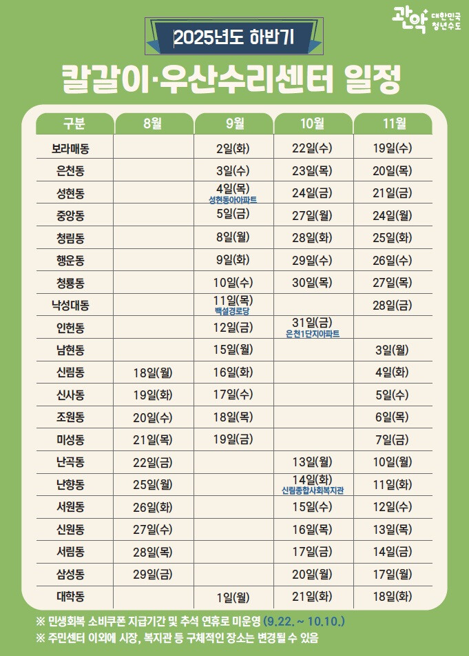 | ▲ 관악구 찾아가는 칼갈이 우산수리 센터 하반기 운영 일정. (사진=관악구청 제공) |