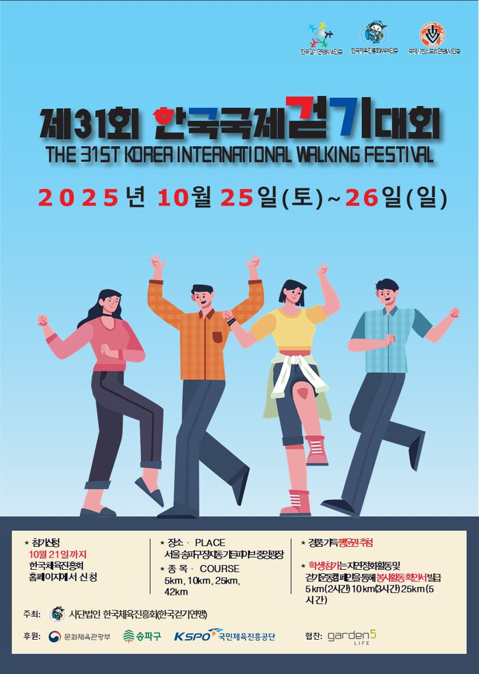 (사)한국체육진흥회(회장 선상규)는 제31회 한국국제걷기대회를 문화체육관광부, 서울특별시송파구, 국민체육진흥공단의 후원으로 오는 25~26일 서울 송파에 있는 가든파이브 중앙광장에서 개최한다.