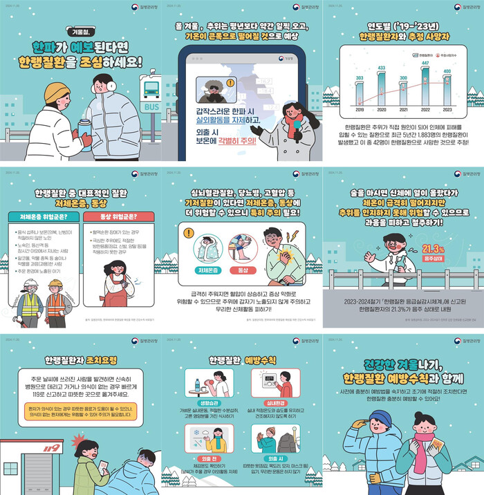 한랭질환은 추위가 직접적인 원인이 돼 인체에 피해를 주는 질환이며, 크게 전신성(저체온증)과 국소성(동상ㆍ동창 등) 질환으로 분류되고 예방이 가능한만큼 미리 예방 및 조치방법을 숙지하는 것이 중요하다.
