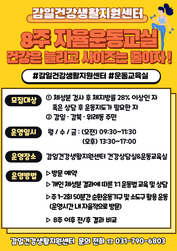 8주 자율운동교실은 감일·감북·위례동 주민들이 감일건강생활지원센터 운동교육실에서 운동할 수 있도록 지원하고자 마련된 프로그램이다. 일반 성인 중에서 체지방률 28% 이상이거나 운동전문가(물리치료사) 상담을 통해 운동 지도가 필요하다고 판단되는 주민을 대상으로 프로그램이 운영된다.