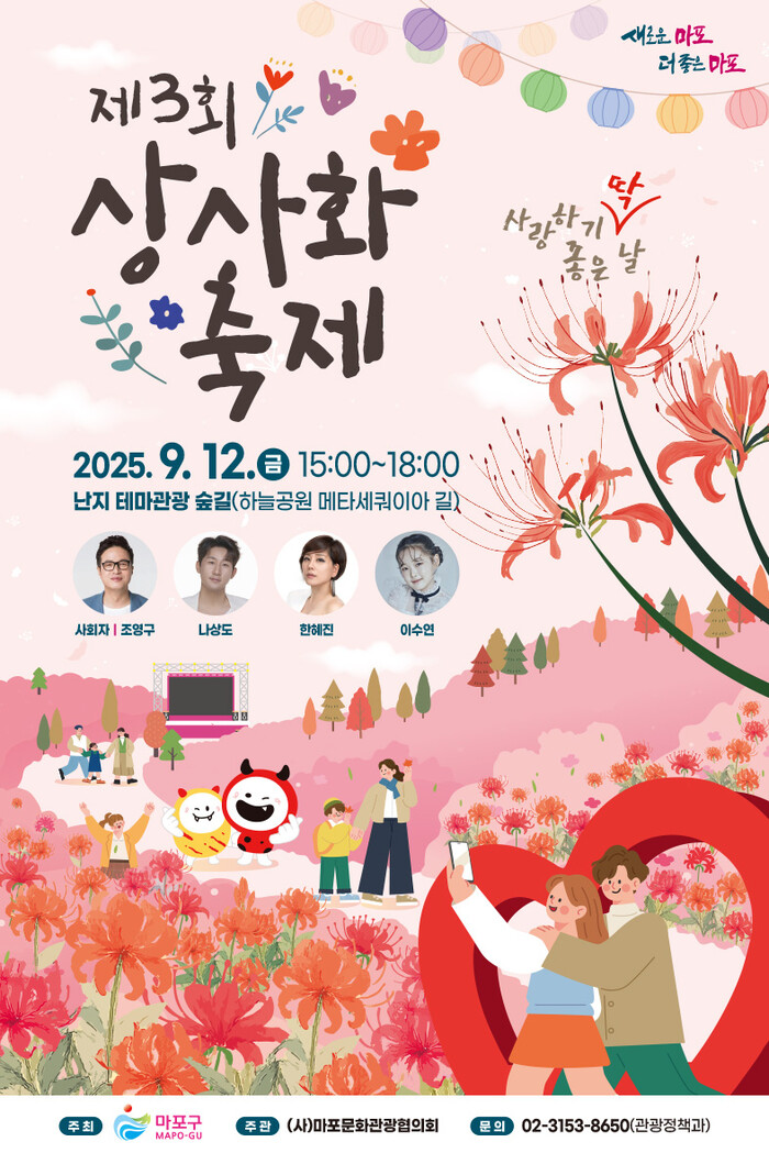 [시민일보 = 문민호 기자] 서울 마포구(구청장 박강수)는 오는 12일 난지 테마관광 숲길에서 ‘사랑하기 딱 좋은 날’이라는 주제로 ‘제3회 마포구 상사화 축제’를 개최한다.
