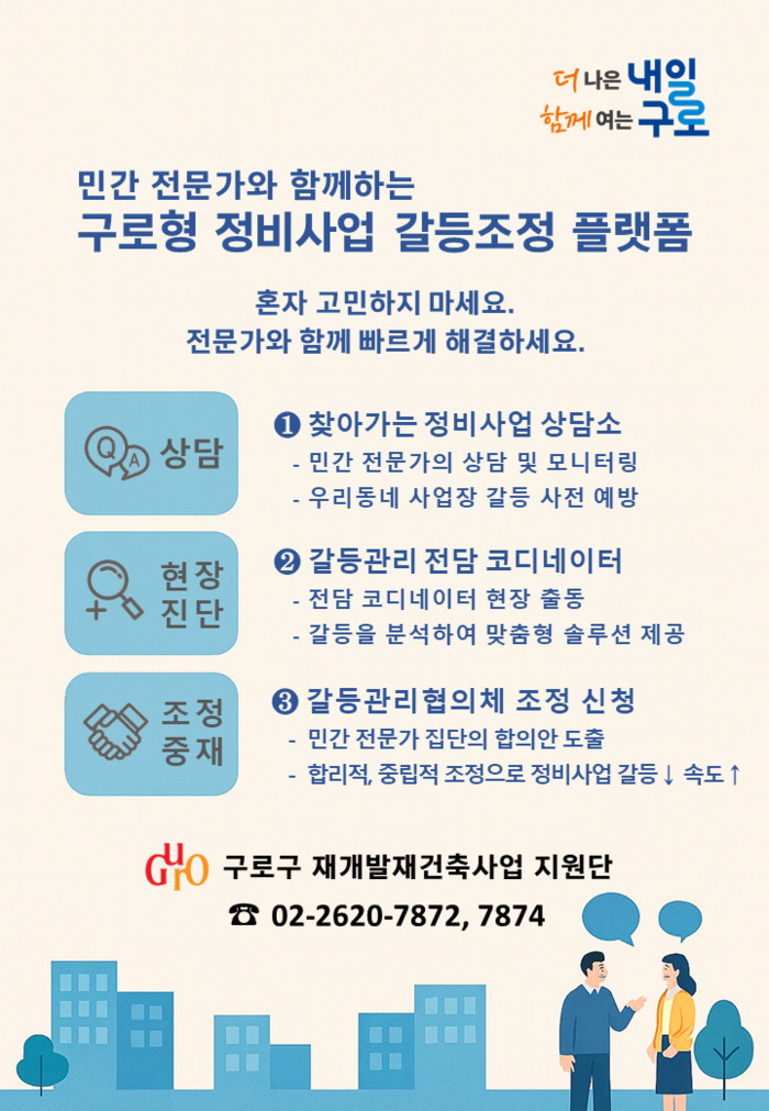 [시민일보 = 박소진 기자] 구로구(구청장 장인홍)가 정비사업 추진 과정에서 반복되는 갈등과 분쟁을 예방하고 안정적인 사업 진행을 지원하기 위해 ‘민간 중심 구로형 정비사업 갈등조정 플랫폼’을 본격 운영한다.