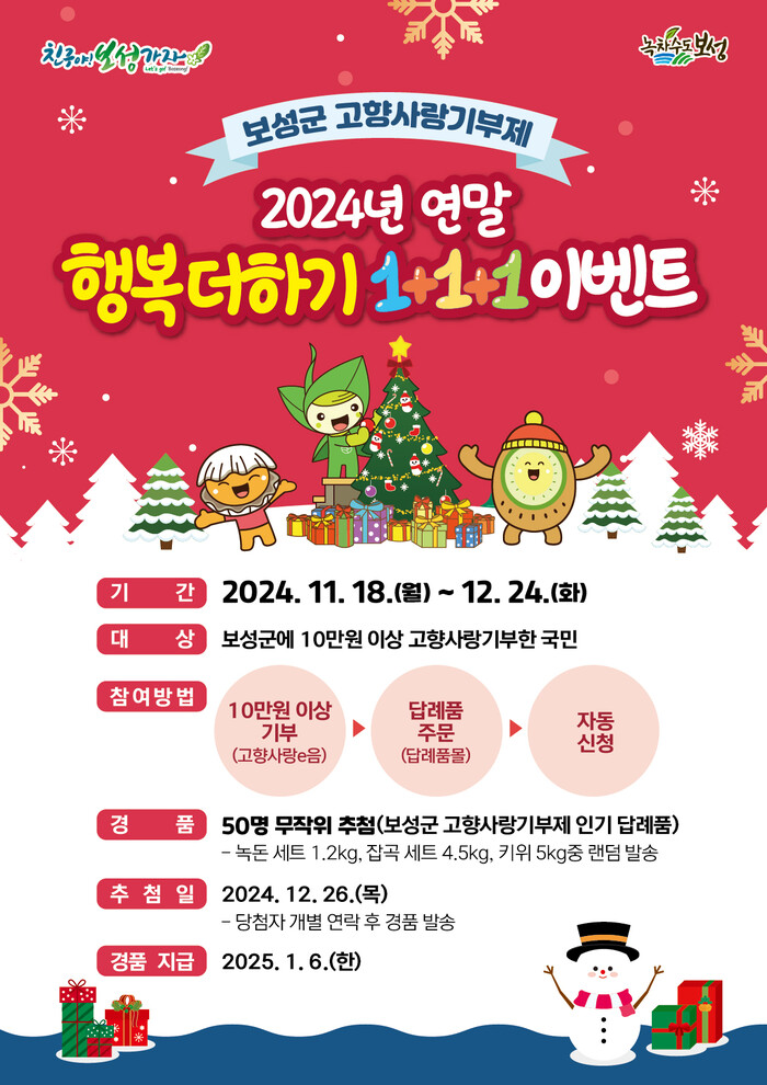 경품은 오는 12월26일 추첨을 통해 당첨자를 개별 발표하고 당첨자 50명에게 3만원 상당의 고향사랑기부제 인기 답례품(녹돈세트ㆍ잡곡세트ㆍ키위)을 2025년 1월6일까지 지급할 예정이다.