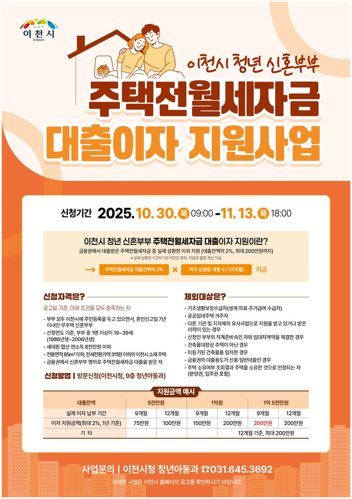 지원대상은 ▲부부 모두가 이천시에 주민등록을 두고 ▲연령(부부 중 1명 이상이 19~39세(1986~2006년생)) ▲소득(세대원 합산 연 소득 8000만원 이하) ▲주택(전용면적 85㎡ 이하ㆍ전세전환가액 3억원 이하의 이천시 소재 주택) ▲대출조건(금융권에서 신혼부부 명의 주택전월세자금 대출) 등을 모두 만족하는 무주택 신혼부부이다.