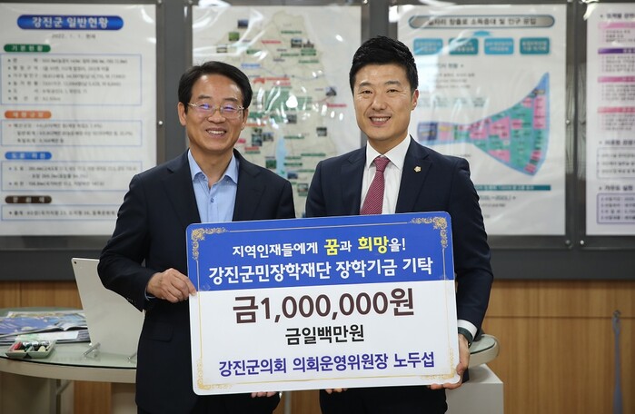 [강진=정찬남 기자] 제 9대 강진군의회 노두섭 운영위원장이 지난 14일, 강진군민장학재단(이사장 강진원)에 일백만 원을 쾌척했다.