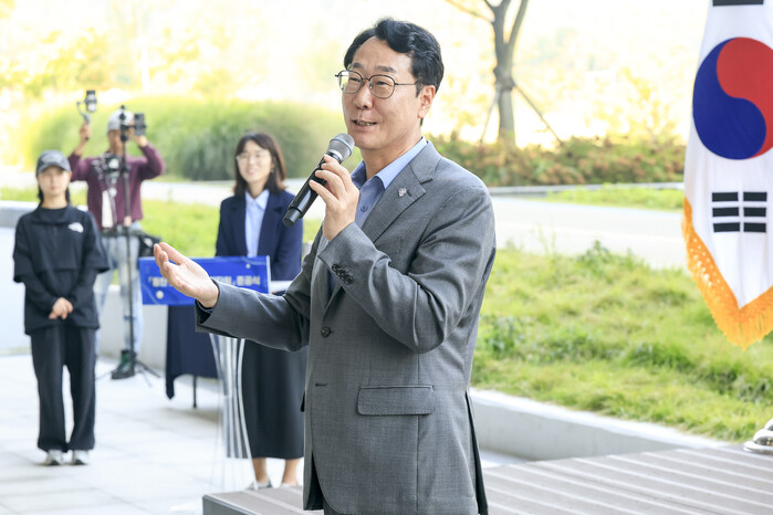 | ▲ 정명근 화성특례시장이 1일 동탄호수공원 주차타워 준공식에서 인사말을 하고 있다 /사진제공=화성특례시 |