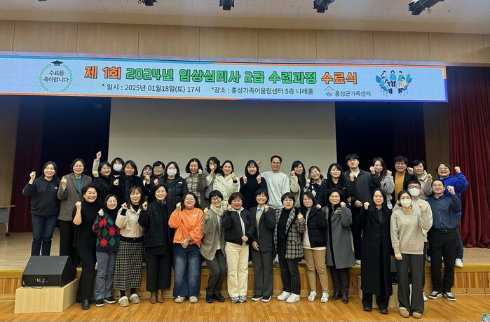 충남 홍성군이 지난 1년간 진행된 아동 심리상담 전문가 양성 및 임상 심리 실무 능력 강화 수련 과정을 무사히 마치고, 최근 수료식을 했다고 밝혔다. 사진은 수료식 참가자들이 기념촬영을 하고 있는 모습. (사진=홍성군청 제공)