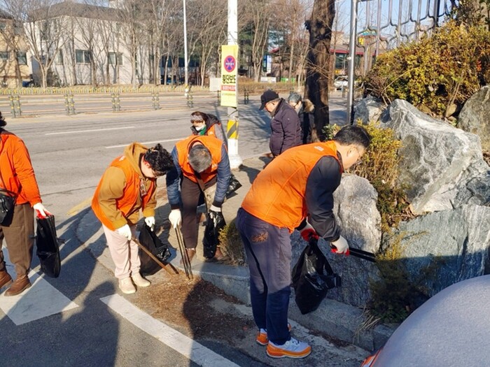 경기 의정부시 신곡1동행정복지센터는 최근 새봄맞이 한마음 대청소를 했다. 참여자들은 주요 도로변, 주택가 및 상가 밀집 지역 등에 겨우내 방치된 쓰레기를 줍고, 불법 현수막을 철거했다. 사진은 참여자들이 쓰레기를 줍고 있는 모습. (사진=의정부시청 제공)