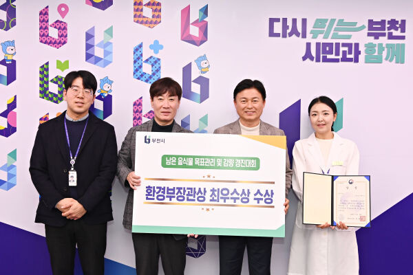 경기 부천시가 최근 환경부에서 주최하고 한국폐기물협회가 주관한 ‘2024년 남은음식물 감량 경진대회’에서 최우수상(환경부 장관상)을 수상했다. 사진은 시상식에서 조용익 시장(오른쪽 두 번째)이 관계자들과 기념 촬영을 하는 모습. (사진=부천시청 제공)