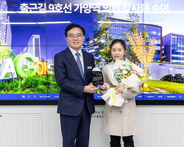 서울 강서구가 12일 지하철 9호선 가양역에서 의식을 잃고 쓰러진 시민을 구한 이선영씨에게 감사패를 전달했다. 사진은 전달식에서 진교훈 구청장(왼쪽)이 이씨(오른쪽)와 기념촬영을 하는 모습. (사진=강서구청 제공)