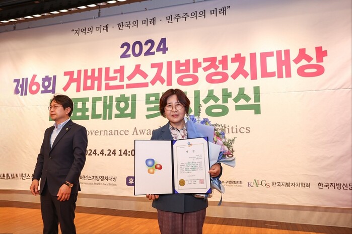 [해남=정찬남 기자] 민경매 해남군의회의원이 지난 24일 국회도서관에서 열린 ‘2024 제6회 거버넌스지방정치대상 공모대회’에서 행정·정치문화혁신 분야 우수상을 수상했다.