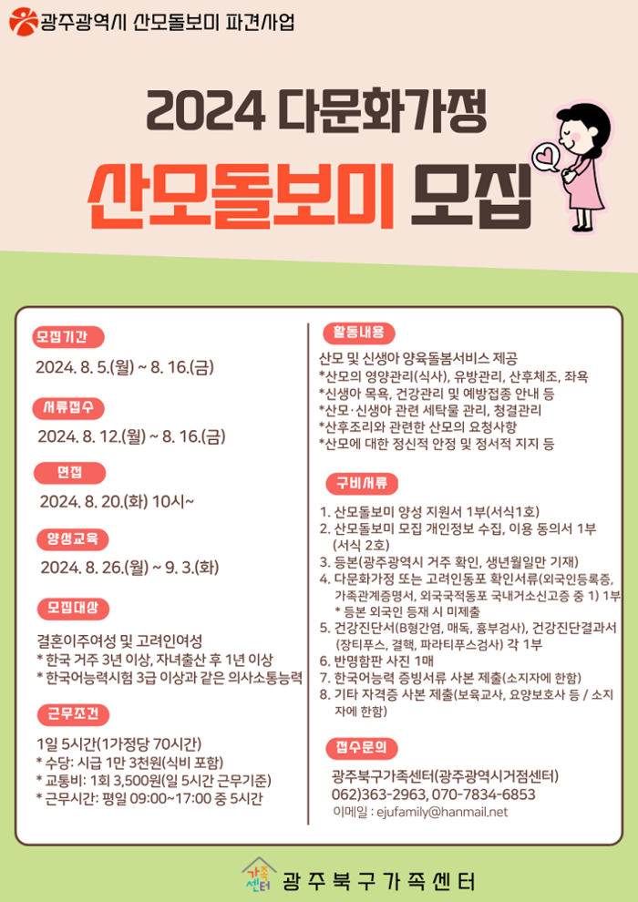 대상은 광주시에 거주하면서 등록된 결혼이주여성과 고려인 산모이며, 출산 후 60일 이내에 돌봄을 신청할 수 있고 미숙아와 선천성 이상아 출산 등으로 입원한 경우 퇴원일로부터 60일 이내 신청하면 된다.