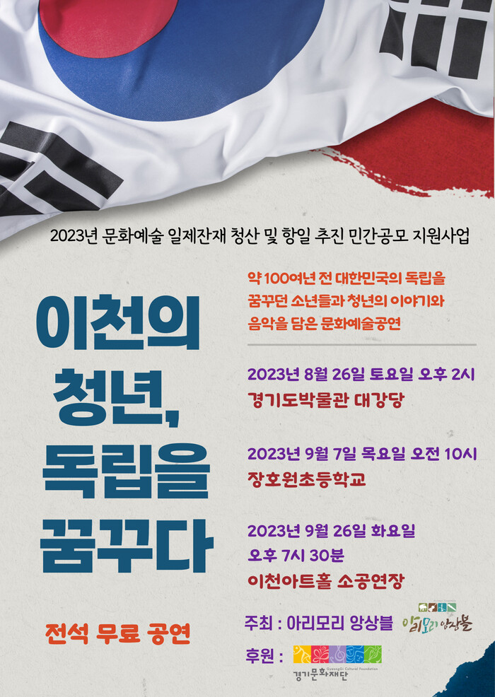 이 작품은 약 100여년 전 일제강점기 시절 대한민국의 독립을 위해 힘쓰셨던 이천의 독립운동가 이야기를 음악과 함께 만나볼 수 있는 프로그램이다. 장호원소학교 14명의 독수리소년단 이야기와 이천의 청년 이수흥 의사 이야기를 아리모리 앙상블의 퓨전국악과 KBS 성우 정의진의 스토리텔링, 그리고 일러스트와 함께 즐길 수 있는 공연이다. 더불어 공연 후 다양한 문화예술콘텐츠까지 연계되는 풍성한 작품이다.