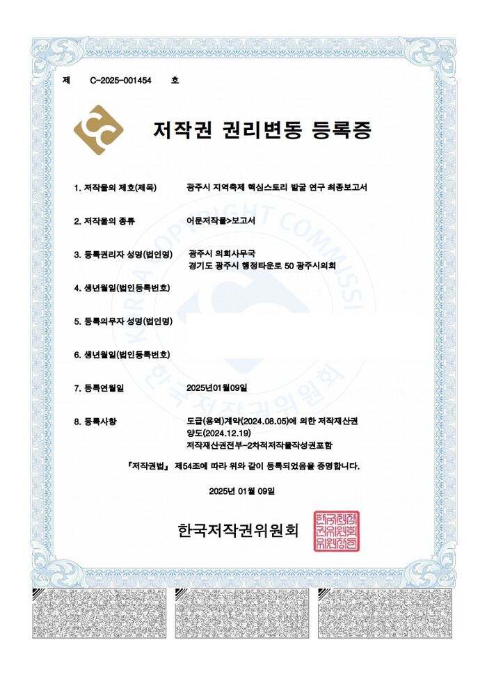 한국저작권위원회에 등록된 ‘지역축제 핵심스토리 발굴 연구 최종보고서’는 광주시 대표 3대 축제인 남한산성 문화제, 왕실도자기 축제, 퇴촌토마토 축제에 접목할 수 있도록 ‘축제발전 연구회’에서 자체 개발한 창작스토리 콘텐츠가 주 내용을 이루고 있으며, 최종권리자는 의회사무국이 된다.