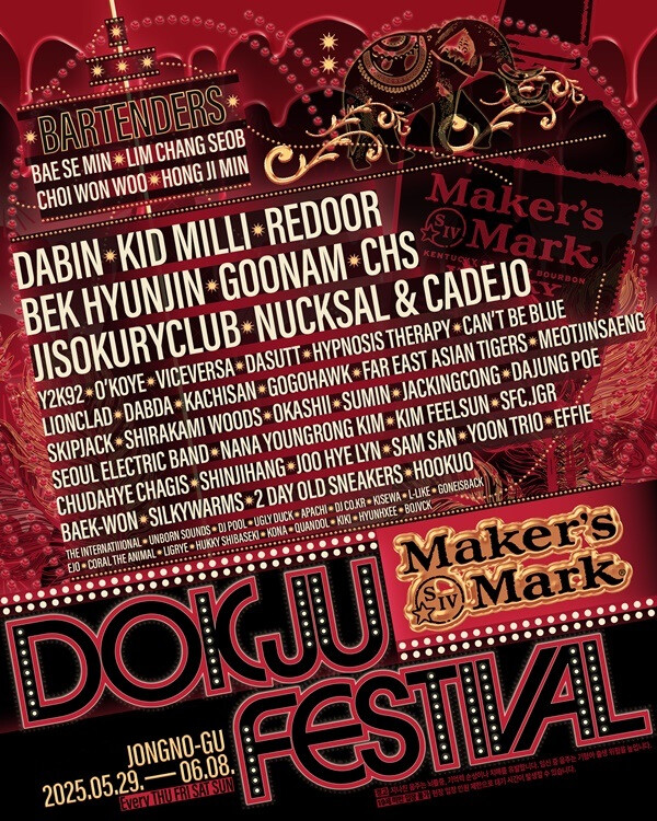 개최일인 29일의 헤드라이너 아티스트 홍다빈의 공연을 비롯해 하루 5팀, 8일간 총 40팀의 다양한 공연이 펼쳐지며, ‘독주 바텐더’가 선보이는 메이커스 마크의 대표 칵테일을 맛볼 수 있는 바(Bar)와, 굿즈 숍 등 감성적이고 문화적인 접점을 통해 브랜드 정체성과 가치를 오감으로 경험할 기회를 제공할 예정이다. 특히, 바텐더가 공연일의 헤드라이너 아티스트에게 영감을 받아 개발한 시그니처 칵테일 등 독주 페스티벌에서만 맛볼 수 있는 칵테일도 판매한다. 목·일요일은 오후 3시부터 12시까지, 금·토요일은 오후 3시부터 새벽 1시까지 운영되며, 칵테일은 한 잔당 5,000원이다.