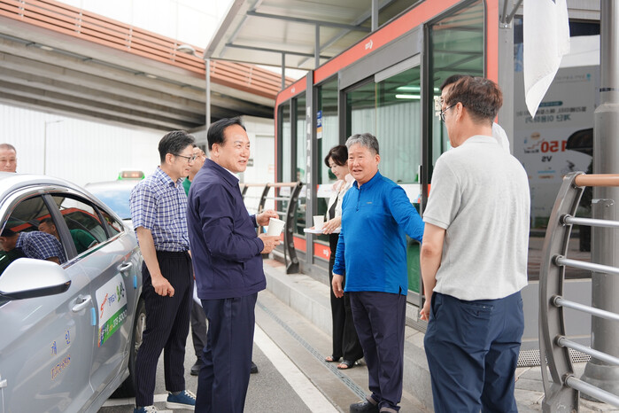 경기 오산시가 최근 민선 8기 취임 3주년을 맞아 택시운수종사자들의 노고를 격려하고 시민 교통 편의 증진을 위한 현장 소통 차담회를 열었다. 사진은 이권재 시장(왼쪽 두 번째)이 택시 기사들과 대화를 나누는 모습. (사진=오산시청 제공)