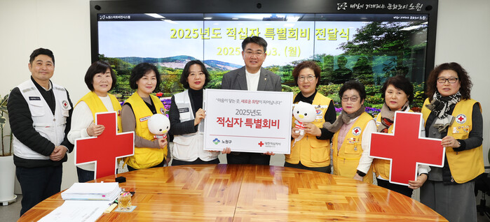 오승록 서울 노원구청장이 최근 구청장실에서 열린 대한적십자사 특별회비 전달식에 참석해 성금을 전달하고 관계자들을 격려했다. 사진은 오 구청장(가운데)이 관계자들과 기념촬영을 하는 모습. (사진=노원구청 제공)