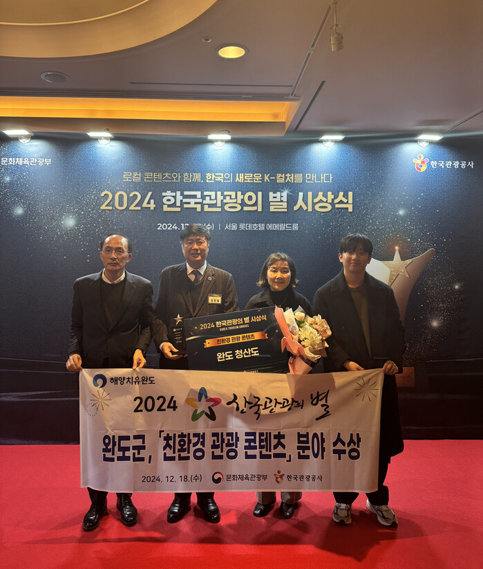군 관계자에 따르면 지난 18일 롯데호텔 서울에서 개최된 한국관광공사 주관 ‘2024 한국 관광의 별’ 시상식에서 완도 청산도가 올해 환국 관광을 빛낸 친환경 관광 콘텐츠 분야에서 본상을 수상했다고 전했다.