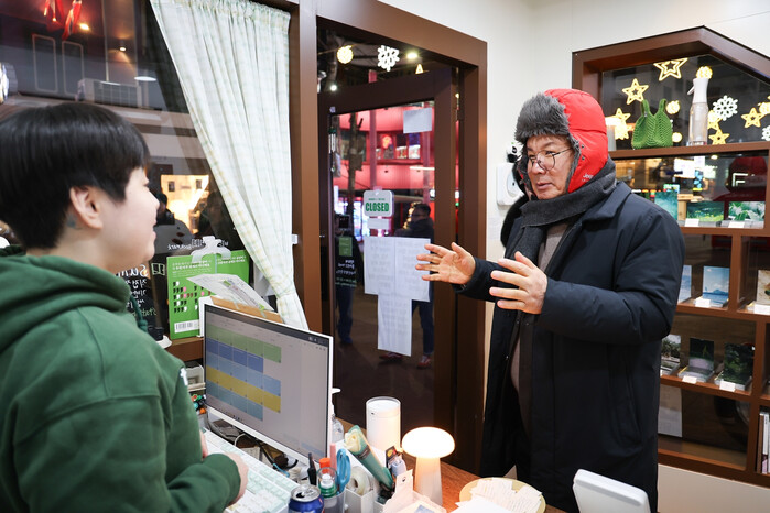 박강수 서울 마포구청장은 지난 21일 레드로드 일대에 방문해 보행환경을 점검하고, ‘청년상인 반년살이’ 운영 현황을 살펴보며 청년상인들에게 응원의 메시지를 전했다. 사진은 ‘청년상인 반년살이’ 매장을 방문한 박 구청장이 청년상인들을 격려하고 있는 모습. (사진=마포구청 제공)