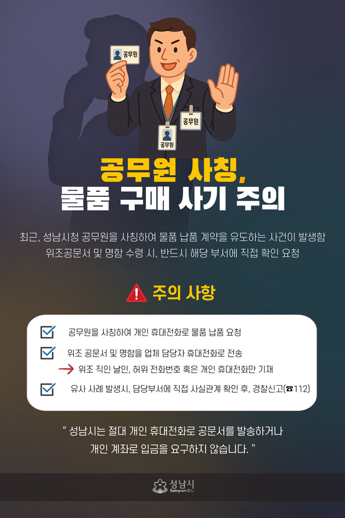 | ▲ 총무과-성남시, 공무원 사칭 물품 구매 사기 주의 당부 안내 홍보물 |