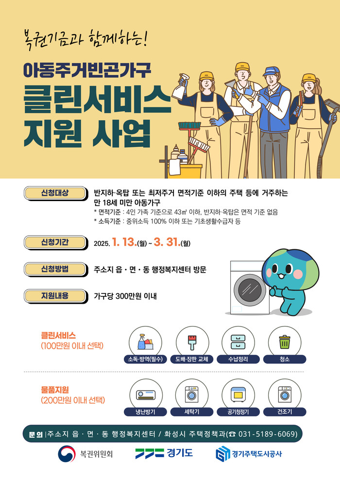 [화성=김정수 기자] 경기 화성시가 오는 3월31일까지 열악한 주거 환경에 거주하는 아동의 주거환경 및 위생 개선을 위한 ‘아동주거빈곤가구 클린서비스 지원 사업’ 대상자를 모집한다.