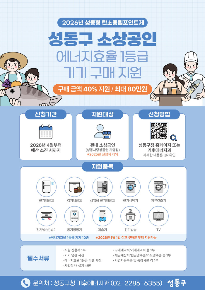 | ▲ 2026년 ‘성동구 소상공인 에너지효율 1등급 기기 구매 지원’ 안내문. (사진=성동구청 제공) |