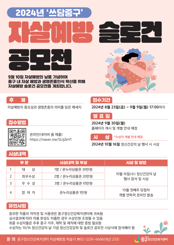 [시민일보 = 여영준 기자] 서울 중구가 자살예방의 날(9월10일)을 맞아 2024년 자살예방 슬로건 공모전(부제: 쓰담 중구)을 개최한다.