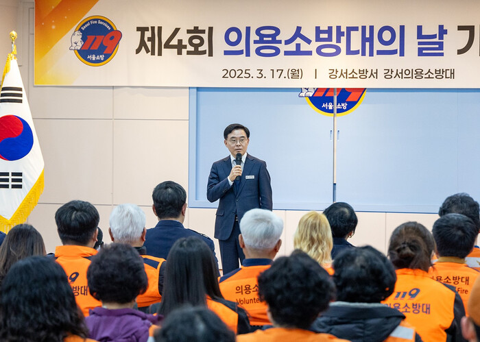 진교훈 서울 강서구청장이 지난 17일 강서소방서에서 열린 ‘제4회 의용소방대의 날 기념행사’에 참석했다. 사진은 진 구청장이 인사말을 하는 모습. (사진=강서구청 제공)