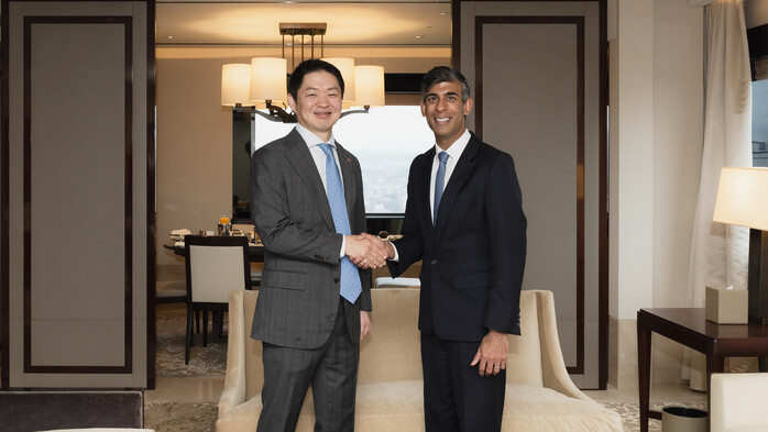 | ▲ 최성환 SK네트웍스 사장(왼쪽)이 리시 수낙 영국 전 총리와 악수를 하고 있다. (사진=SK네트웍스 제공) |