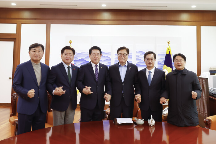 | ▲ 강기정 광주광역시장은 4일 국회에서 우원식 국회의장을 면담하고 윤석열 대통령의 비상계엄 선포 및 해제 관련 대응책을 논의했다. 강 시장은 이에 앞서 국회에서 열린 더불어민주당 비상시국회의, 5·18민주광장에서 열린 광주시민비상시국대회 등에 참석했다. 사진 왼쪽부터 김관영 전북특별자치도지사, 오영훈 제주도지사, 김영록 전남도지사, 우원식 국회의장, 김동연 경기도지사, 강기정 광주광역시장. /광주광역시 제공 |