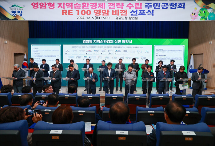 이 자리에 참여한 39개 지역 앵커기관ㆍ기업 등은 ‘영암형 지역순환경제 실천 협약’을 맺고, 그 의지의 표명으로 퍼포먼스에도 나섰다.