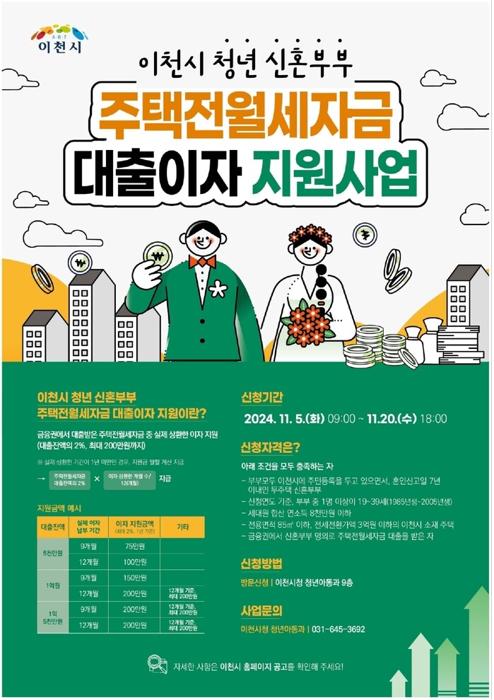 [시민일보 = 민장홍 기자] 경기 이천시가 청년 신혼부부의 주거비 부담을 완화하여 안정적인 지역 정착을 지원하기 위해 주택전월세자금 대출이자를 지원한다고 밝혔다.