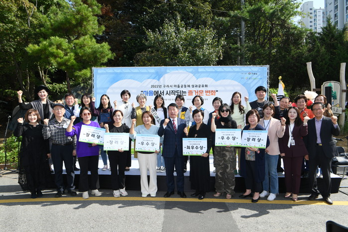 경기 구리시는 최근 인창동 마을공동체 활동 대상지에서 ‘마을에서 시작되는 즐거운 변화’ 마을공동체 성과공유회를 개최했다. 사진은 백경현 시장(가운데)이 수상자들과 기념촬영을 하는 모습. (사진제공=구리시청)