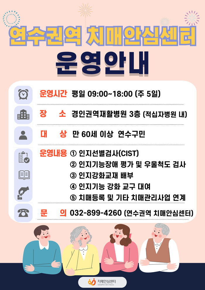 이에 따라 연수권역 치매안심센터(적십자 병원내 경인권역재활병원 3층)는 운영일시를 기존 주 2일에서 주 5일로 확대 운영하고, 운영시간도 오전 9시부터 낮 12시까지 운영하던 것을 오후 6시까지 확대한다.
