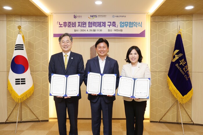 [부천=문찬식 기자] 경기 부천시가 국민연금공단 및 서울신학대학교와 지난 29일 지역 특화 노후준비 지원을 위한 업무협약을 체결했다고 밝혔다.